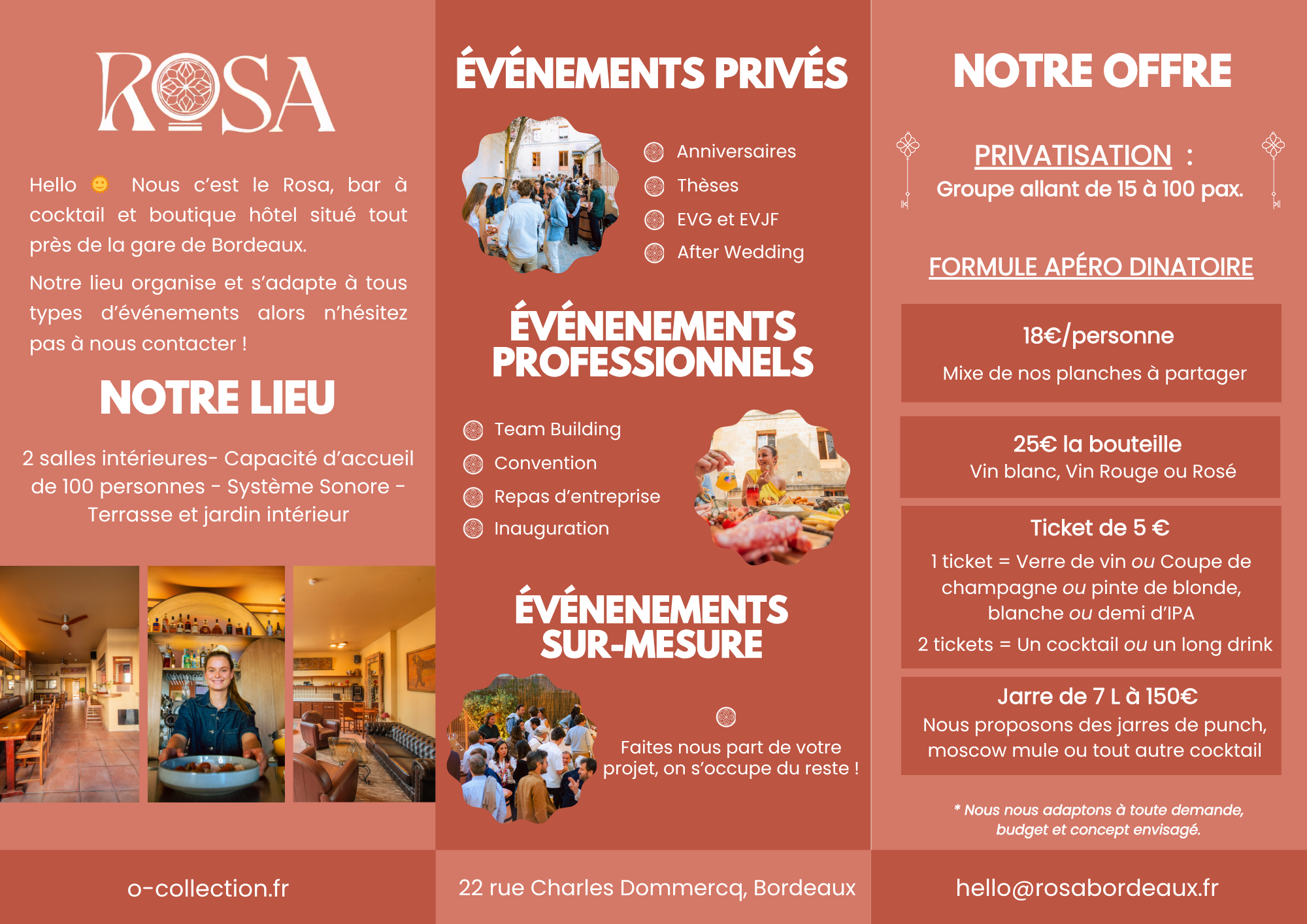 Bienvenue au ROSA’s BAR, un lieu convivial pour boire un verre et se retrouver, avec la chance de profiter d’un jardin intérieur calme et apaisant.